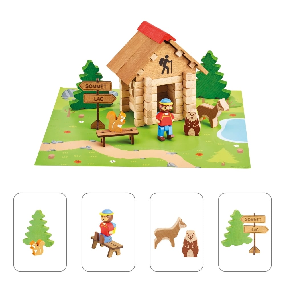 La cabane de Montagne 55 pièces, jeu de construction en bois naturel et teinté, fabriqué en France par Jeujura. À partir de 5 ans.