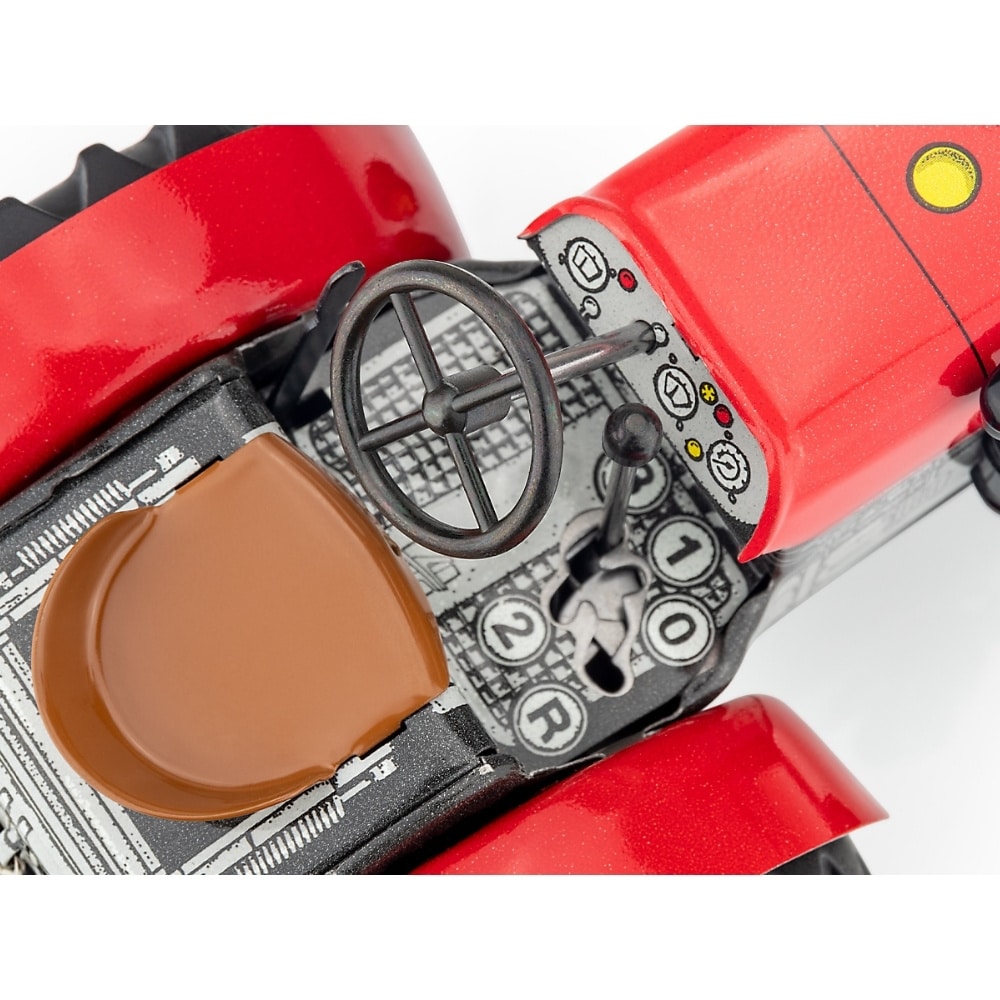 Tracteur mécanique en tôle emboutie, représentant un Zetor 25 A rouge, pourvu de 3 vitesses, un point mort et une marche arrière.